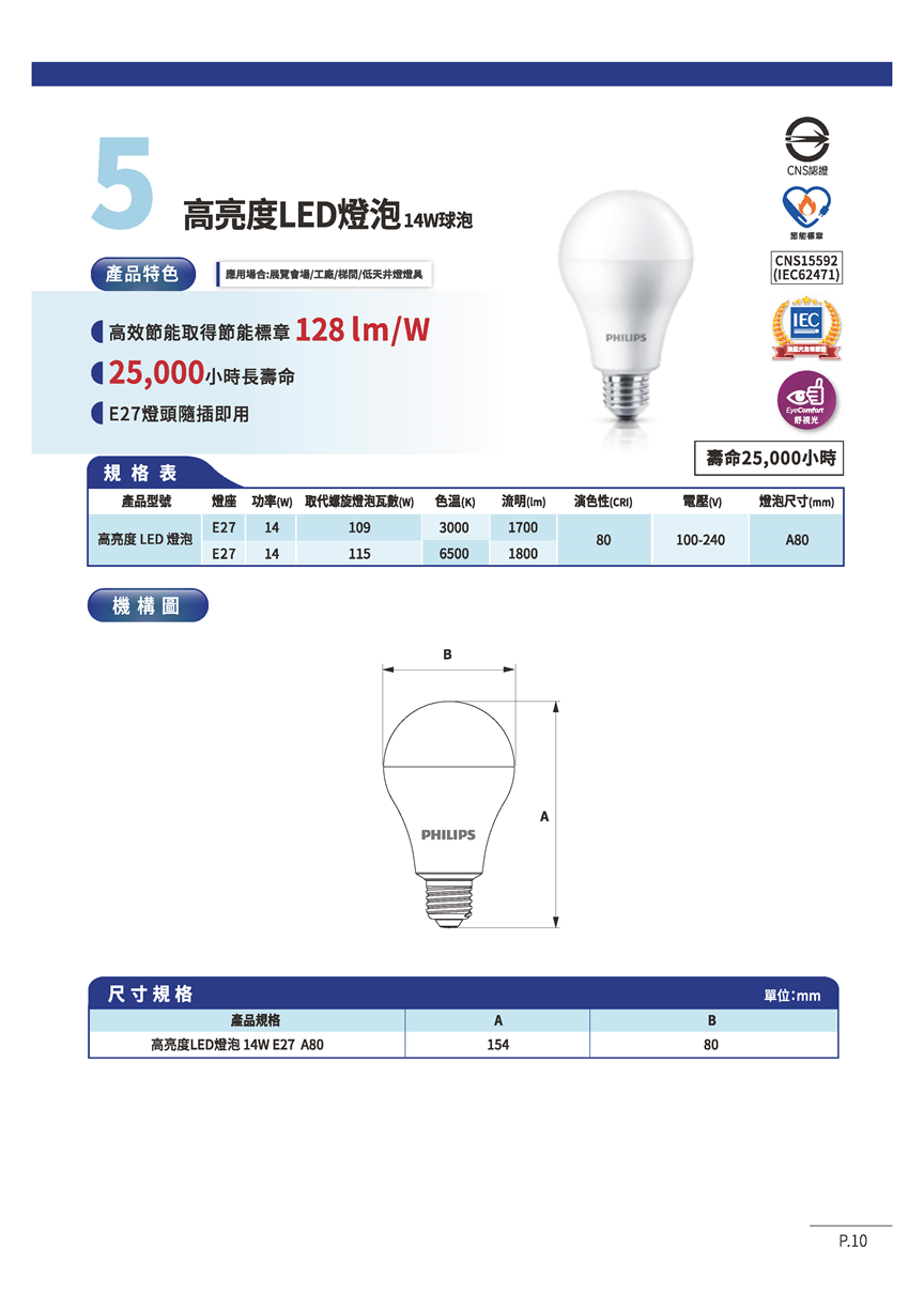 Philips 飛利浦 LED高亮度燈泡-14W球泡