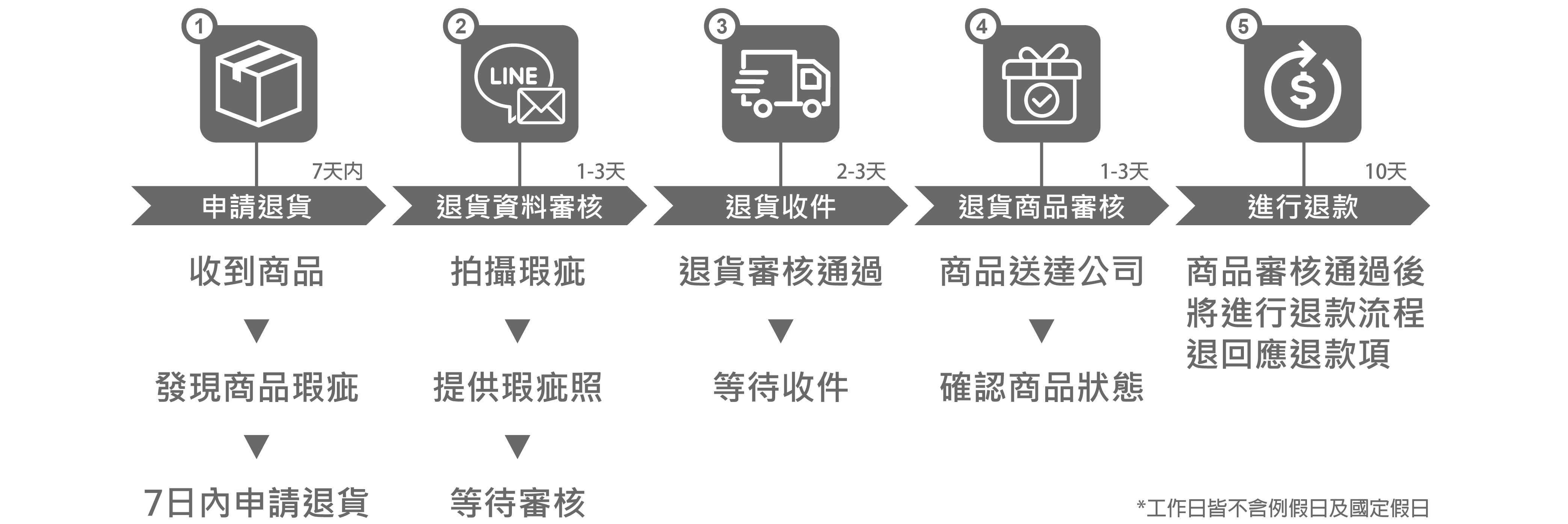 商品送達後,僅接受「一次」【部分商品退貨】、【全部商品退貨】,以及商品瑕疵的【同商品換貨】,不接受不同商品的換貨(商品名稱外觀不同即